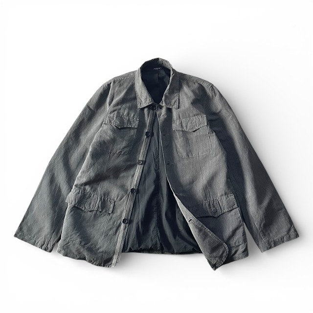2008年にロスのフレッドシーガルで 行われたリーバイスと アンディ・ウォーホルのコラボで それのデザインをしたのが あのダミアン・ハーストという トリプルなスペシャルコラボ 最近またSupremeとも2回目の コラボをしここ日本でも一般的に とても有名なダミアンがその頭角を表した 少し後、 一般層までその知名度を上げた要因の 一つがリーバイスの度重なる プッシュにもありました。 俺も昔リーバイスに勤めていた時期だったので 日本でジーンズにペイントをする ライブイベントを見に行ったことがあります。 当時はスカルばっか描いてた時期 このコラボの時ロスのフレッドシーガルは 非常に洒落てるとされてたショップでした。 ロンハーマンだって元々はフレッドシーガルの 1コーナー的なカテゴリーでした。 日本での展開は失敗しちゃった フレッドシーガルでしたが 当時は本当結構イケてたんだから。 俺も当時の彼女にフレッドシーガルの グミ入り瓶とか お土産に買ってかえってたもんな 話逸れて申し訳ない。 まぁとにかくそんな素晴らしいコラボ 当時のイベントの図録みたいな 本もあってそれも結構高値で 取引されてます。 このジャケットもシャツっぽい 軽い感じの着心地で通年使える感じ ミリタリーモチーフと テーラードジャケットが組み合わさった そんな感じのシャツジャケ カジュアルなんだけどちょっと シュっとしててとても今の気分です。 少しトラッド感があるというかね。 超激レアアイテム コンディションはDeadだったんですが なんせ埃臭かったので うちで洗濯をしました。 なんで1washのベリーグッド コンディションです。 是非。 COLOR GREY STRIPE SIZE L表記 【実寸】 肩幅48.5 身幅57 袖丈67 着丈78 *単位は全てcm,計測方法により若干の誤差が出ます。実寸は参考までに。 尚、この商品はusedになりますので現状でのお渡しとなりますのでご了承下さい。 着用モデル176cm