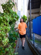 カンゴールのハンチングを後ろに被ってる